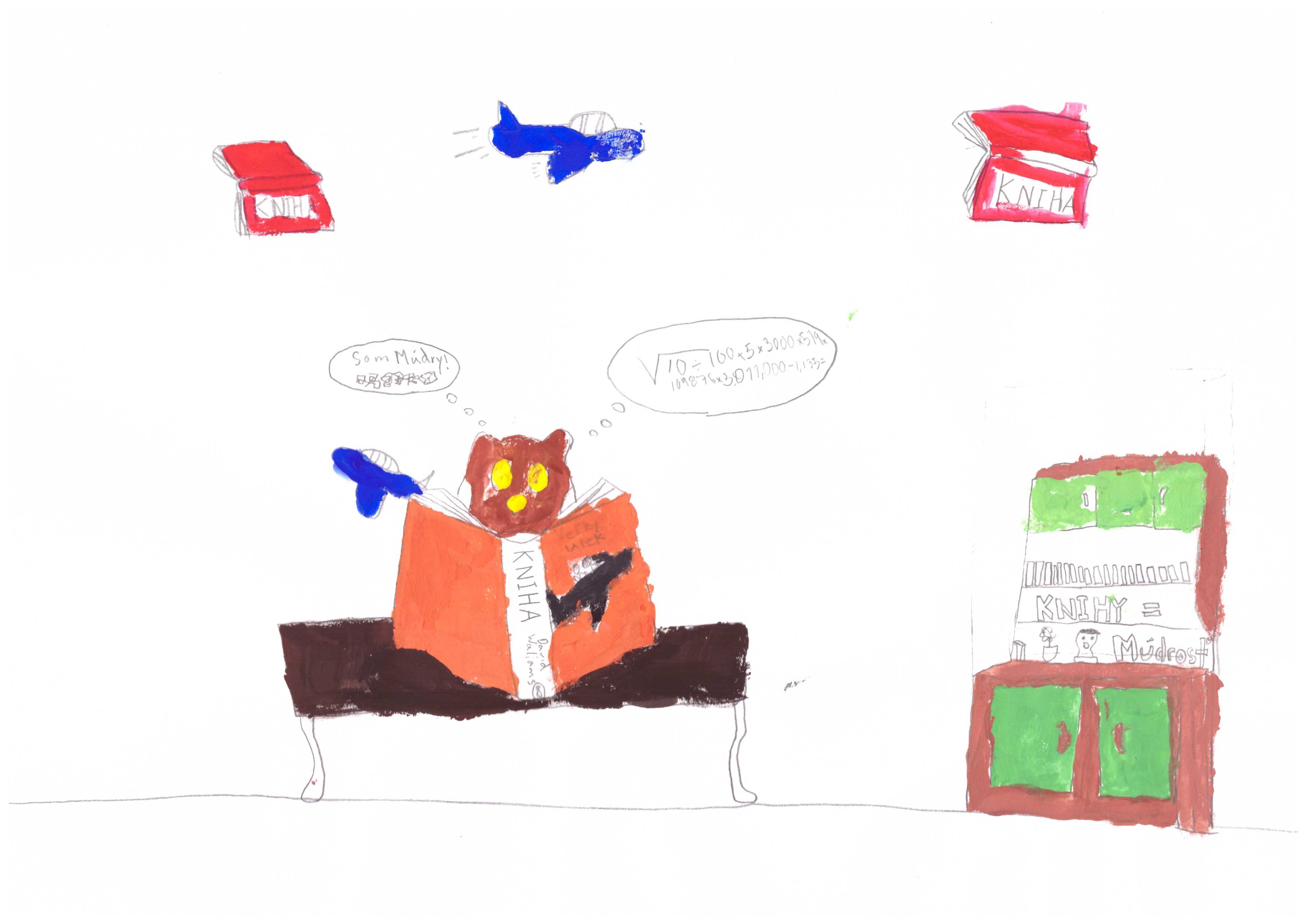Knižnica na prvom stupni je teraz plná slovenských obrázkov. Je ich 58 a môžu tam zostať až do konca roka. Sú medzi nimi plagáty, kreslené vtipy, krátke eseje, ilustrácie, vysvetlenia: čoskoro ich spolu s krstným menom umelca uverejníme aj na webových stránkach.